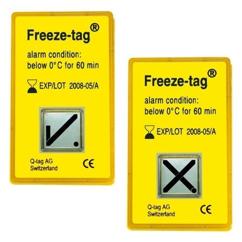 Фриз-тэг (Freeze-tag) желтая наклейка - ниже 0°C в течение не менее 60 минут.