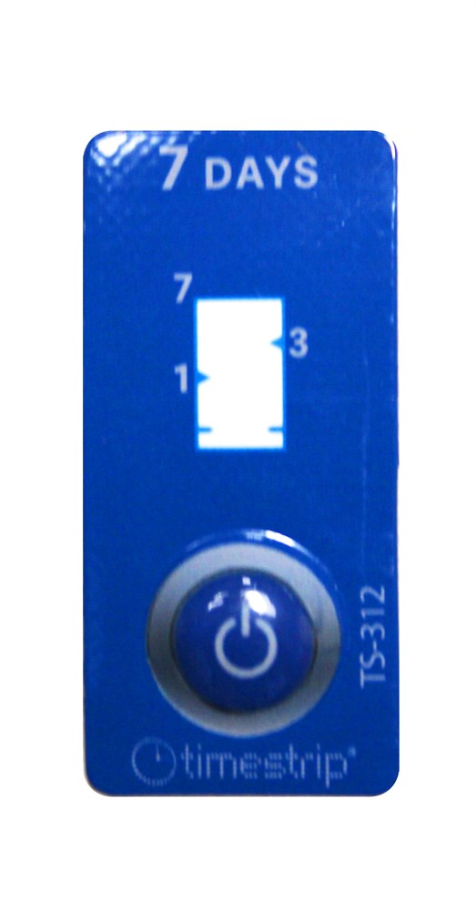 Активация. Кнопка активации расположена на лицевой части индикатора. Плотно сожмите блистер. После активации в окне появляется строка активации, которая продолжает заполнять окно цветом. Индикатор "Таймстрип время" можно наклеить напрямую на продукт, сняв клейкую подложку с обратной стороны.
